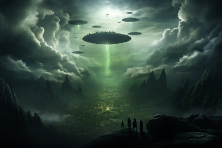 The start of an aliens invasion. Science fiction scene with alien spaceship and mysterious lights. Generative AI illustration