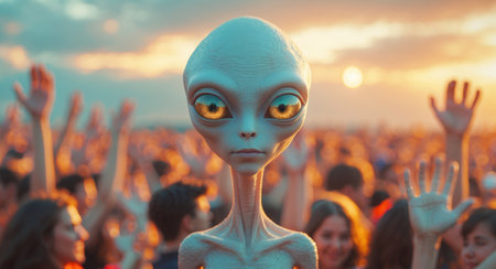AI Generated. Extraterrestrial figure attending an outdoor gathering during sunset with an audience in the background