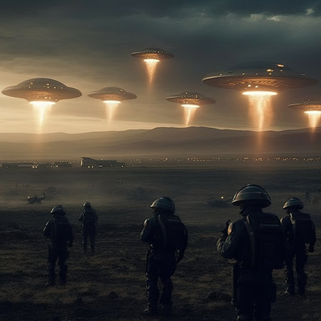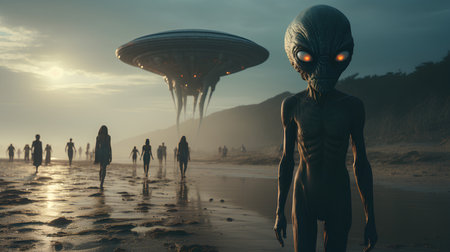 Alien Encounter: A speculative portrayal of an encounter between humans and extraterrestrial beings.Generated with AI