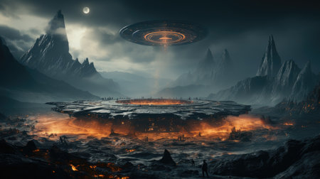 Immerse yourself in a breathtaking sci-fi spectacle as an enigmatic UFO descends from the vastness of the cosmos, casting an ethereal glow upon a barren desert landscape Its enigmatic presence illuminates the clear blue sky with a mesmerizing explosion of light, sparking awe and curiosity This captivating art portrays the visceral encounter between extraterrestrial visitors and our realm, inviting you to ponder the mysteries of the universe AI Generative