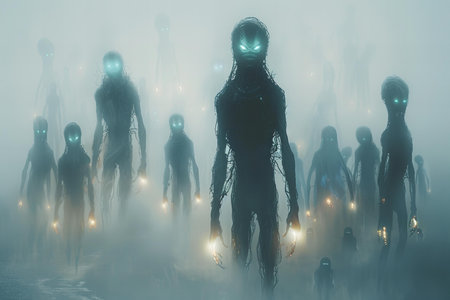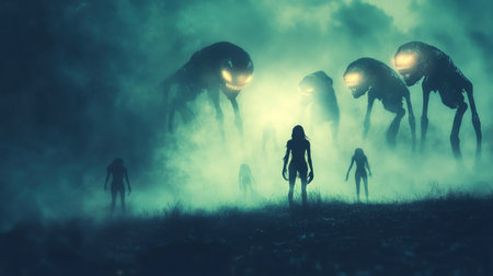 A group of shadowy figures stands against a backdrop of fog and twilight, facing towering, monstrous creatures with glowing eyes, creating a haunting atmosphere.