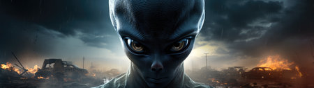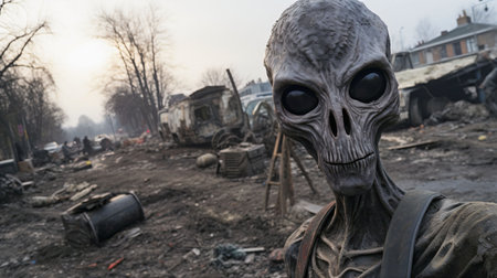 An AI generated illustration of an alien taking a selfie near the debris of a destroyed urban area