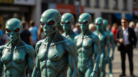 Aliens in a busy city street among people. Extraterrestrial beings blending into urban life. Concept of alien encounter, extraterrestrial presence, science fiction, urban setting, alien invasion.