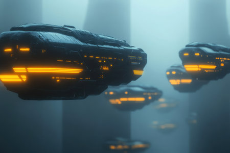 Several sleek, high-tech spacecraft glide through a dense fog, illuminated by vibrant glowing lines.