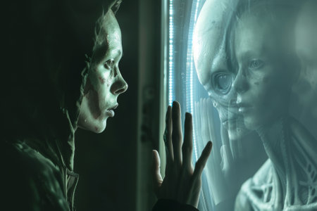 A woman is looking at a reflection of another woman in a mirror. The reflection is of a strange alien. The woman is wearing a hoodie and she is in a dark room. Scene is eerie and mysterious