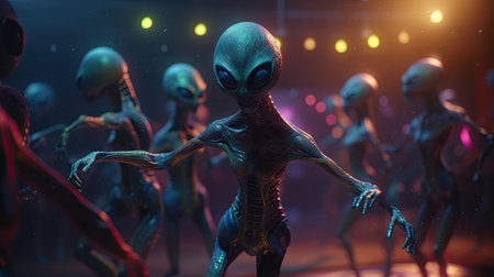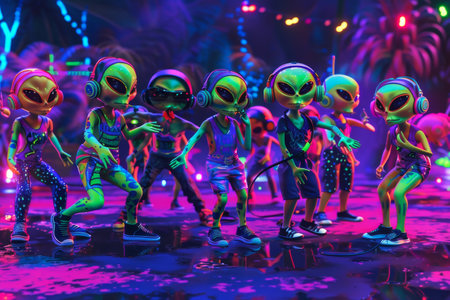 A group of neon-glowing aliens enjoy a dance party with vibrant lights and tropical backdrop.