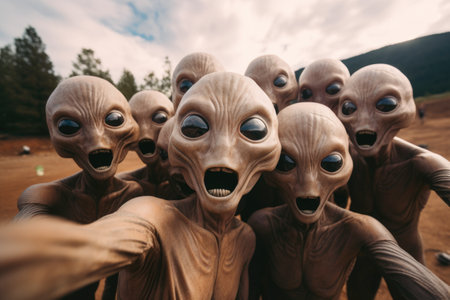 Group of aliens taking a selfie showing surprised expressions.