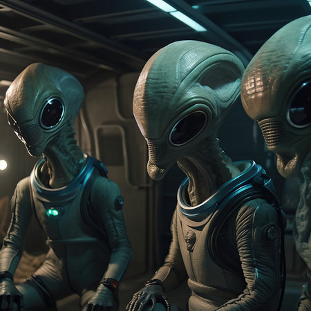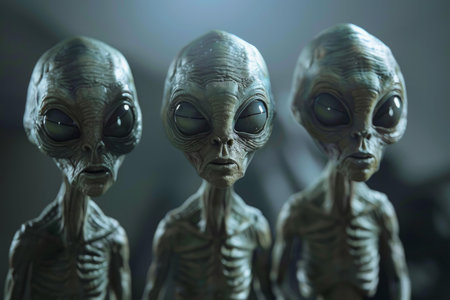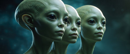 Three alien humanoids with pale skin and captivating eyes are observing something, creating a sense of mystery and wonder about the vastness of the universe and the possibility of life beyond earth