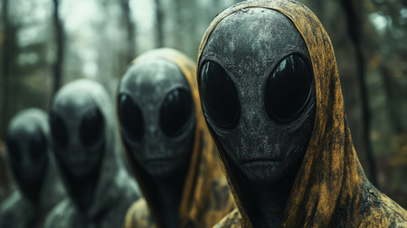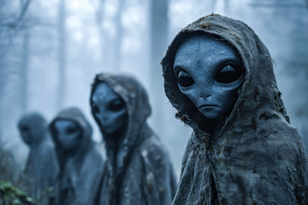 Dark extraterrestrial figures in hooded cloaks in a misty forest, eerie atmosphere. Alien encounter in mysterious woods concept