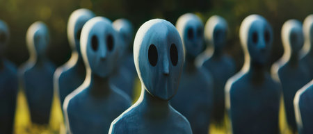A row of blue figures stand in a line outdoors. The figures are faceless, with large, black eyes. They are positioned in front of a blurred, green background, and the sun is shining brightly on them.