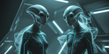 AI Generated. Alien beings with distinct features in a futuristic setting showcasing advanced attire and mysterious aura