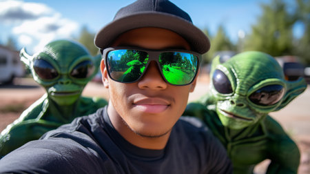 Man taking a selfie with alien figures in background.