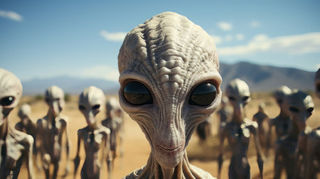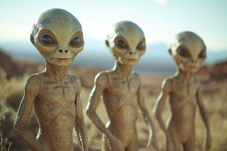 In a sunlit desert setting, three extraterrestrial beings stand side by side, exhibiting large heads and expressive eyes while surrounded by arid terrain and distant mountains.