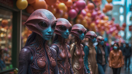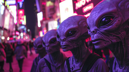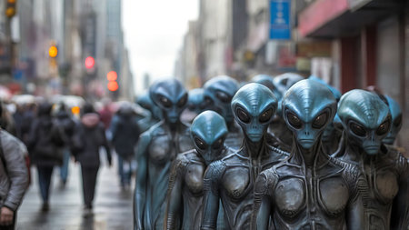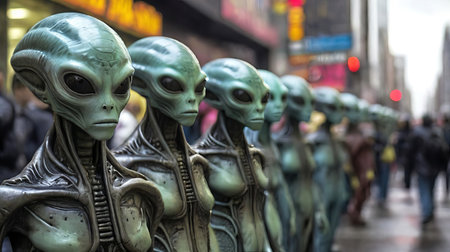 Aliens standing in line in an urban area. Extraterrestrial beings blending into a city setting. Concept of alien presence, urban environment, science fiction, crowd.