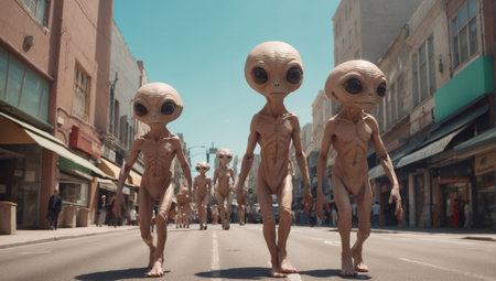 Aliens in a busy city street among people. Extraterrestrial beings blending into urban life. Concept of alien encounter, extraterrestrial presence, science fiction, urban setting, alien invasion.