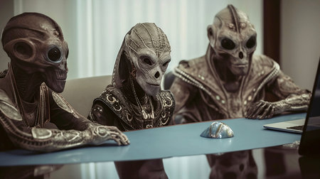 An AI generated illustration of three extraterrestrial beings positioned around a contemporary designed desk