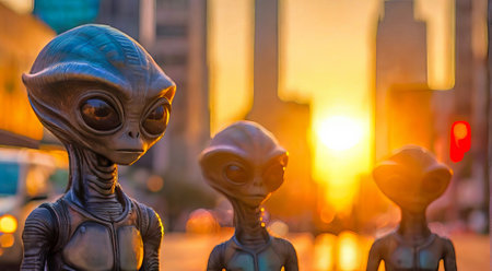 Group of aliens at sunset in a city. Extraterrestrial beings in an urban setting with a sunset backdrop. Concept of alien encounter, sci-fi theme, sunset cityscape, and extraterrestrial life.