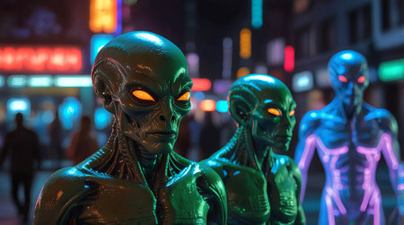 Futuristic aliens with glowing blue eyes in a neon-lit cityscape. Extraterrestrial beings in a vibrant urban setting. Concept of sci-fi, futuristic, extraterrestrial, and neon lights.