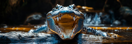 a close-up photo of a dark and ominous great white alligator in water. this captivating image, rendered in cinema4d with vray tracing, showcases the strong facial expression of the alligator. the dark yellow and dark navy tones add to the eerily realistic and visually storytelling nature of the photo. ai generated