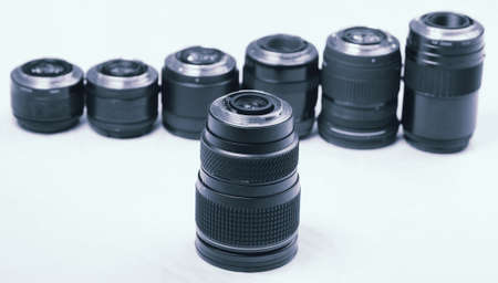 Ukraine, Kiev, 5 August 2020. Collection of vintage cameras and camera lens well organized, top view. Group old cameras. On white background