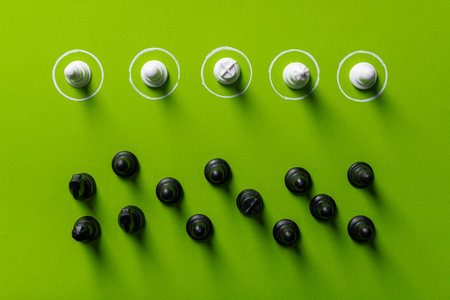 Pieces of XO game, abstract composition, multiple x pieces against o piece, simulation of conflict.
