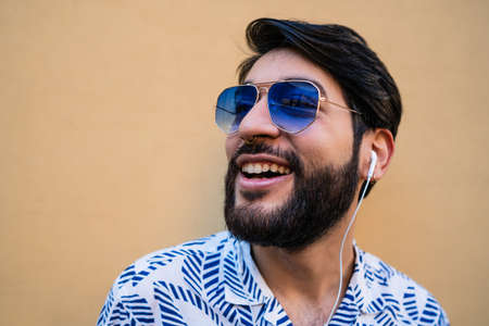 Portrait of young latin man wearing summer clothes and listening to music with earphones against yellow background.