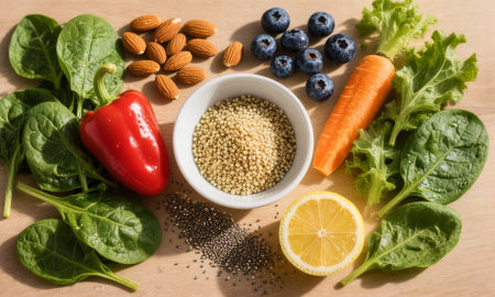 Healthy food ingredients: quinoa, spinach, carrot, pepper, lemon, almond, chickpea, arugula and chia seeds