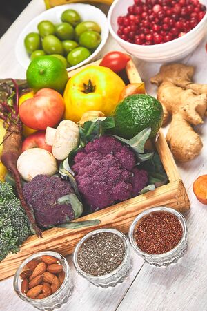 Healthy eating ingredients: fresh vegetables, fruits and superfood. Clean eating and detox. Nutrition, diet, vegan food.