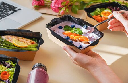 Close up of a young beautiful girl is sitting eating a salad at home and uses her computer. She is in her room