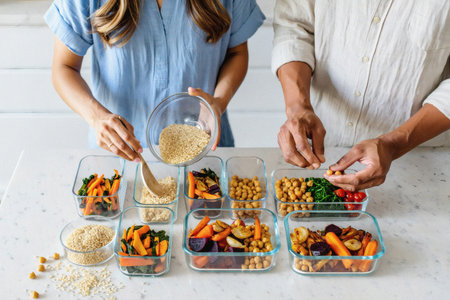 Couple Preparing Healthy Meal Prep Containers with Quinoa and Roasted Vegetables