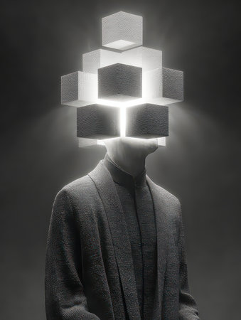 This thought-provoking image explores the intersection of identity and technology, featuring a figure with a block structure on its head. The monochrome tones enhance the surreal atmosphere, provoking deep thought about the human experience.