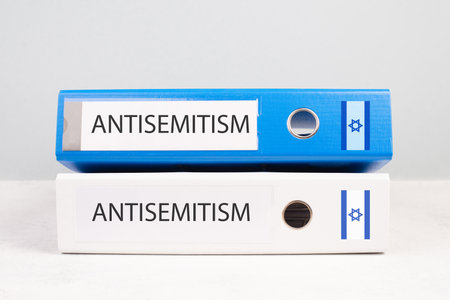 Folder file with cases of antisemitism, jewish religion, conflict, hostility, prejustice and racism, flag of Israel, David Star