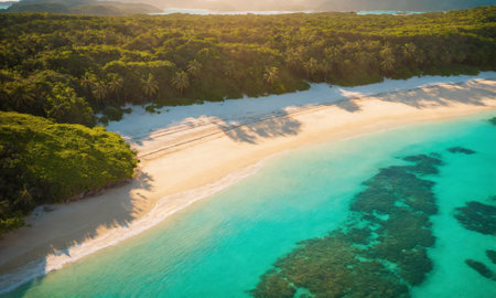 Tropical island paradise with white sand beach and turquoise waters awaiting relaxation
