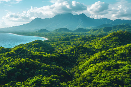 Majestic mountain range rises in the background overlooking a vast expanse of lush green forest leading to a serene coastline. fluffy clouds dot the sky, creating a picturesque tropical paradise ideal for nature lovers. Generative AI