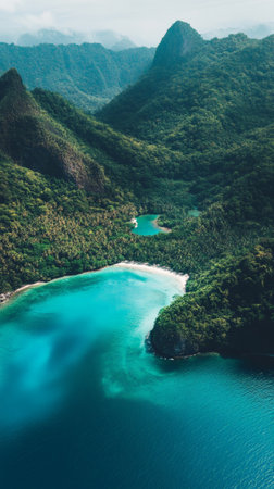 Breathtaking aerial view of a secluded lagoon with turquoise water nestled amidst lush green mountains covered in tropical vegetation, creating a serene and idyllic landscape