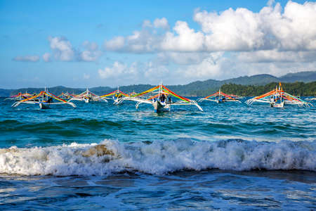 Many boats in the turquoise lagoon, view from above.Seascape with blue bay and boats. traditional Filipino wooden outrigger boat called a banca. Summer and travel vacation concept