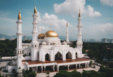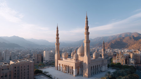 A stunning mosque stands majestically against a backdrop of mountains and a bustling city, capturing the essence of culture and tradition in a serene setting.