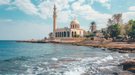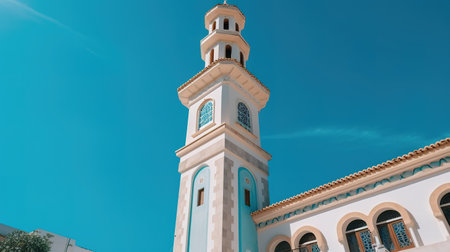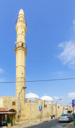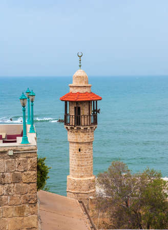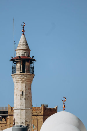 Tower of Bahr Mosque or Sea Mosque on blue sky background. Old city of Jaffa, Israel.