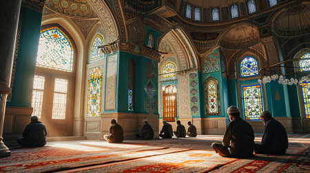 Religious Muslim people praying in the mosque. Ramadan celebration