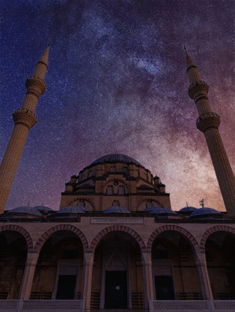 Domes and minaret of the mosque from the courtyard near the cave where it is believed Prophet Abraham was born, in Sanliurfa, Turkey.
