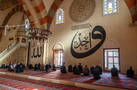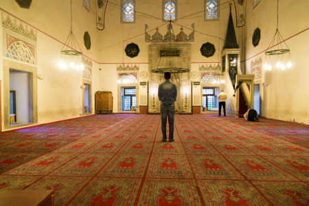 EDIRNE - TURKEY, MARC 9: Undefined muslims praying in Edirne Old Mosque on March 9, 2019. The Old Mosque is an early 15th century Ottoman mosque in Edirne, Turkey