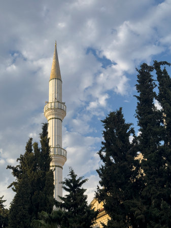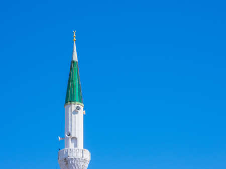 ALANYA, TURKEY - 26th MAY, 2021. Minaret of a mosque with a green dome