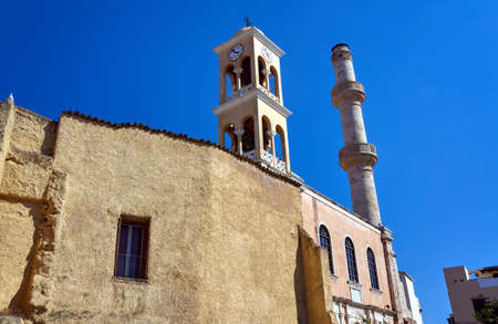 Orthodox church with a bell tower and minaret in the town of Chania, Crete