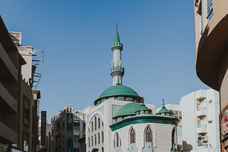 Dubai, UAE - January 6, 2020: Street view of a mosque with green domes and minaret in Deira district