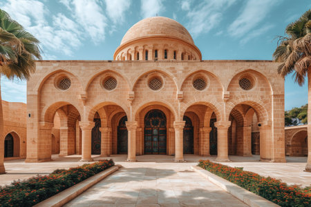 Photo of Sharm el-Sheikh's soft beige mosque with two tall minarets, surrounded by lush greenery and colorful flowers under a clear blue sky in Egypt's coastal city, shot on a Canon EOS C70 at eye level. --ar 3:2 --v 6.1 Job ID: 797bffb0-674f-44d1-8e02-3a31c2037fc9