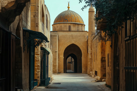 Stunning view of a traditional Islamic mosque with a golden dome and minaret, located at the end of a narrow street in an old city
