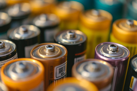 Focused Closeup shot of multiple batteries cells. Storage of alkaline battery with positive ends. Generate ai