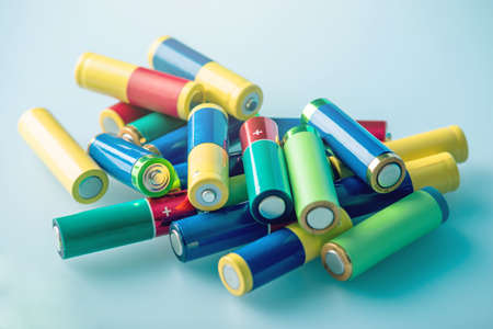 Colorful batteries alkaline 1.5 Volts in size AA on blue background