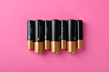 The batteries are placed in a triangle in the upper corner of the photo, in the opposite lower corner there are two batteries on a white background. top view, flat lay, copy space, isolate