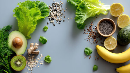 Healthy food clean eating selection: fruit, vegetable, seeds, superfood, cereals, leaf vegetable on gray background. Created with Generative AI